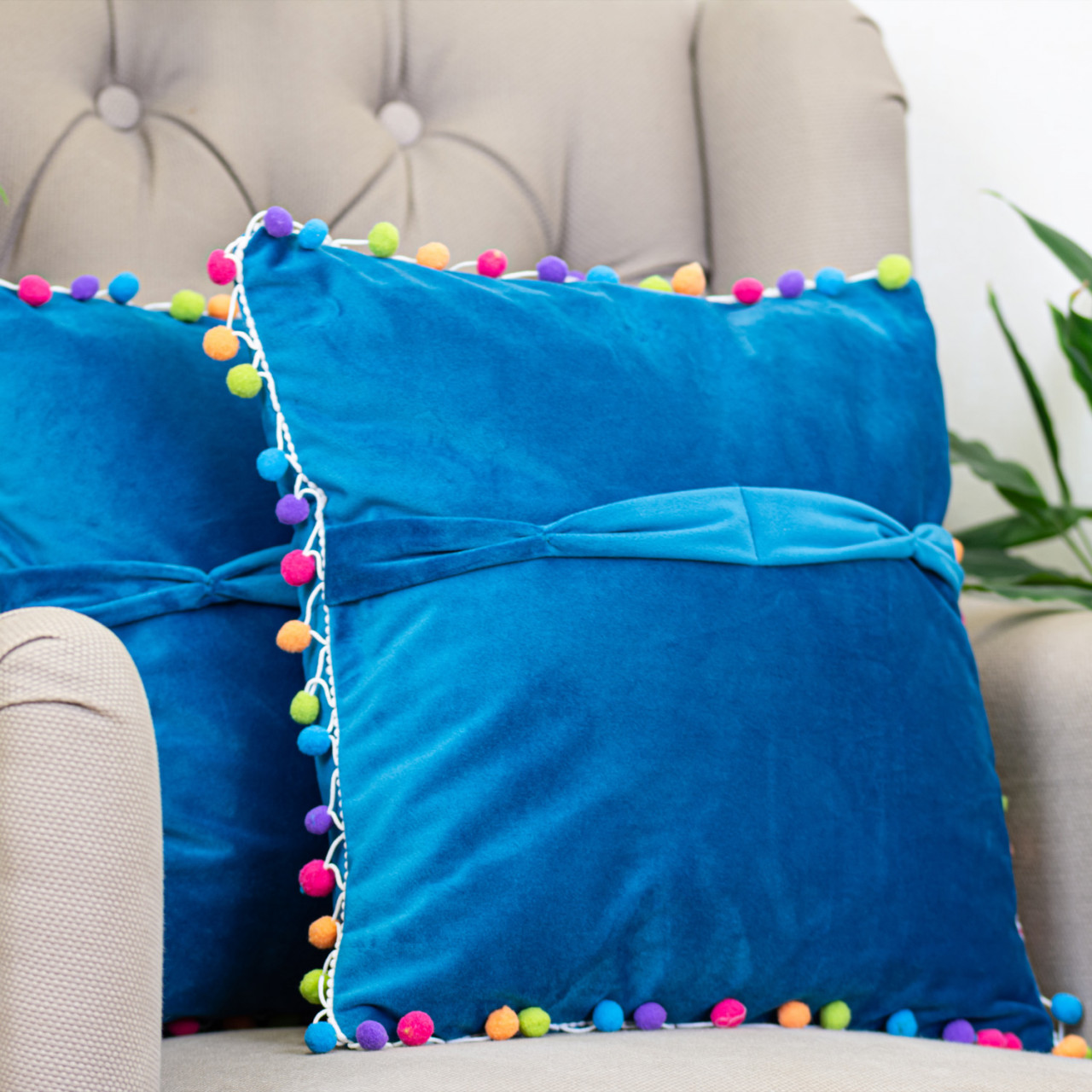 Set doua perne decorative cu fata detasabila, catifea galbena COMFY Fantasy cu pom pom colorati 2x40x40cm