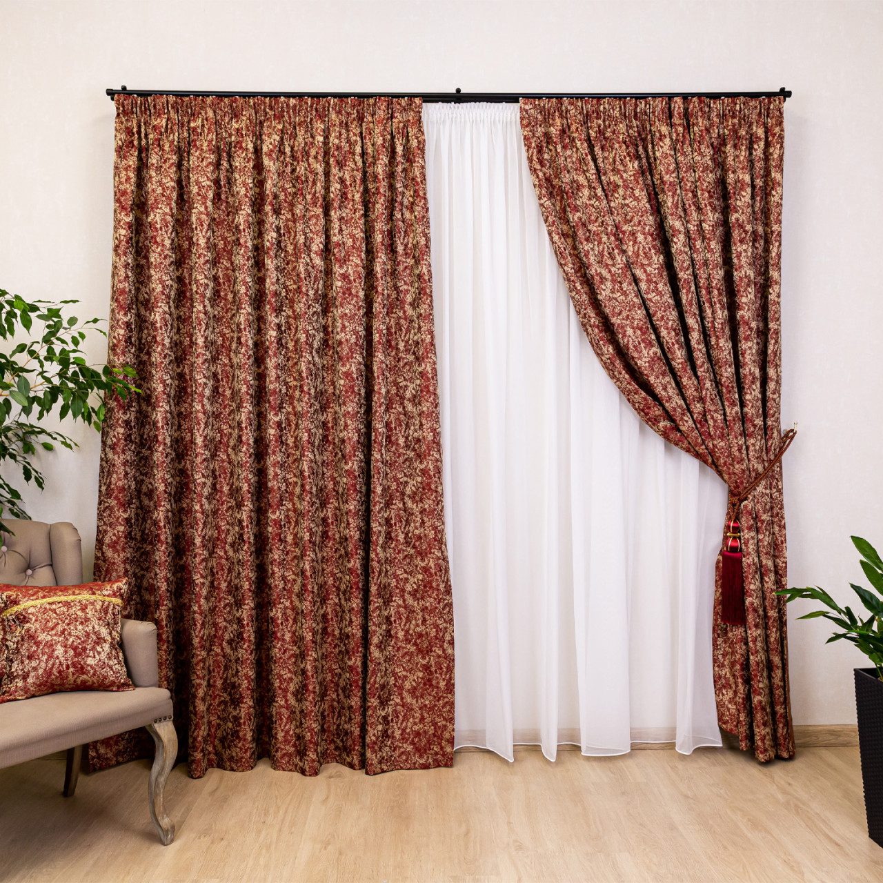 Set 3 piese , doua draperii Hiko Royal Garden rosu bordeaux si o perdea Ana voal alb cu rejansa