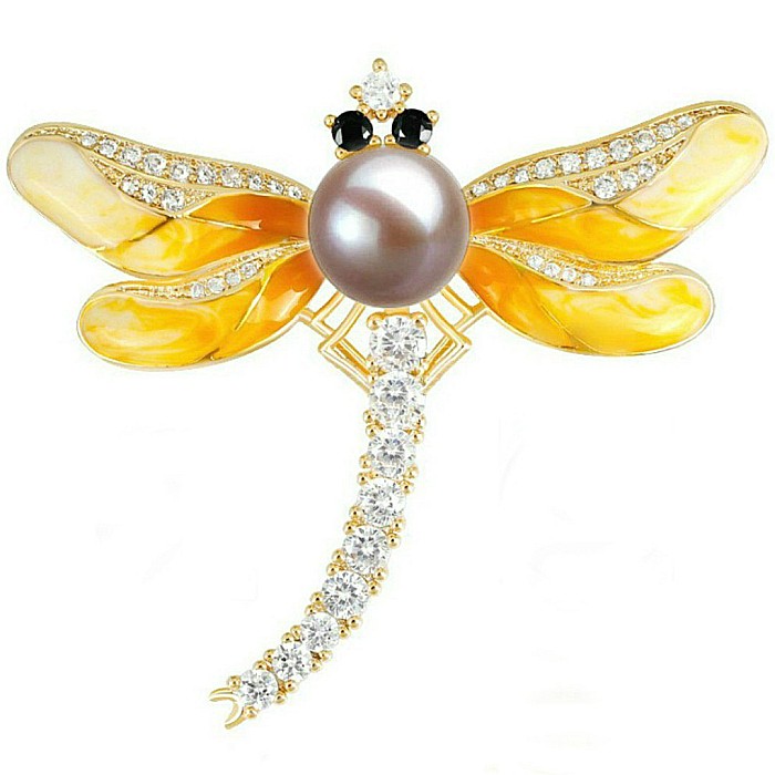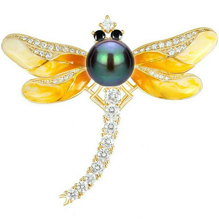 Brosa Libelula Galbena cu Perla Naturala Neagra si Zirconii