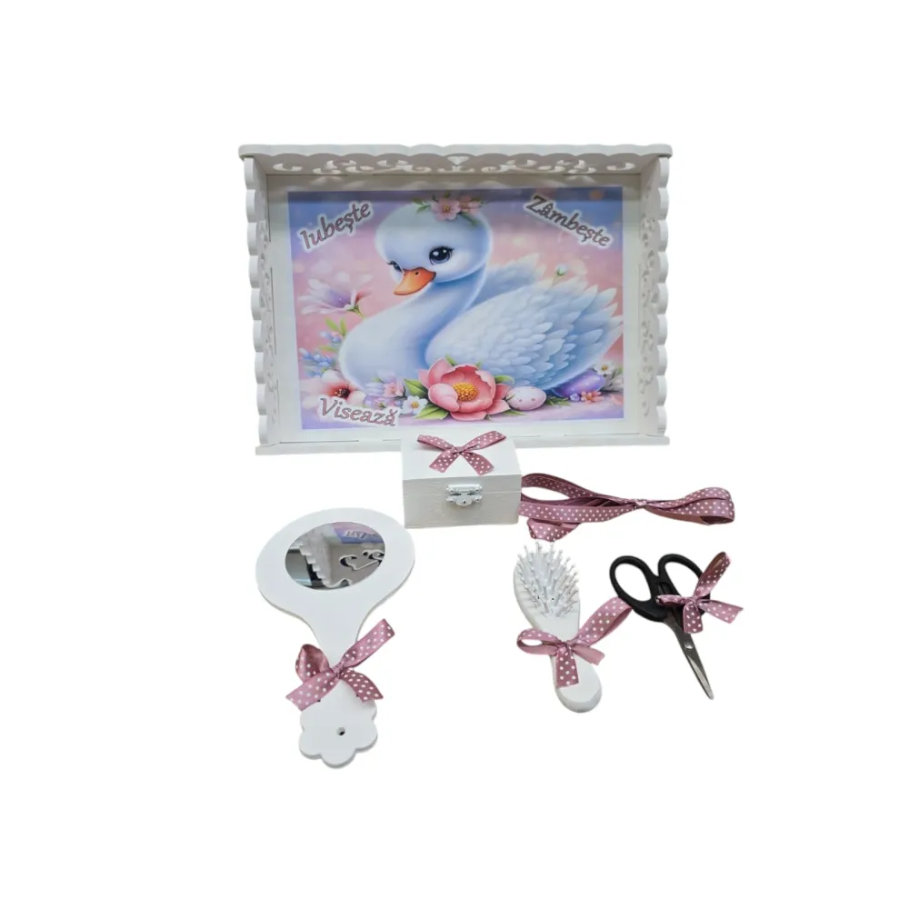Set Trusou Botez si Lumanare, 9 Piese, cu Lebada, Alb si Roz, din Catifea - TB254
