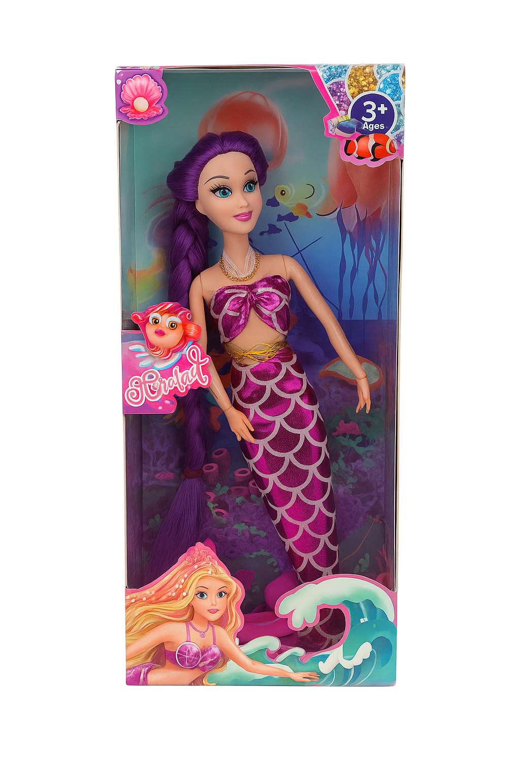 Papusa Sirena cu Par Mov Impletit si Coada Lila Sidefata, 32x14 cm