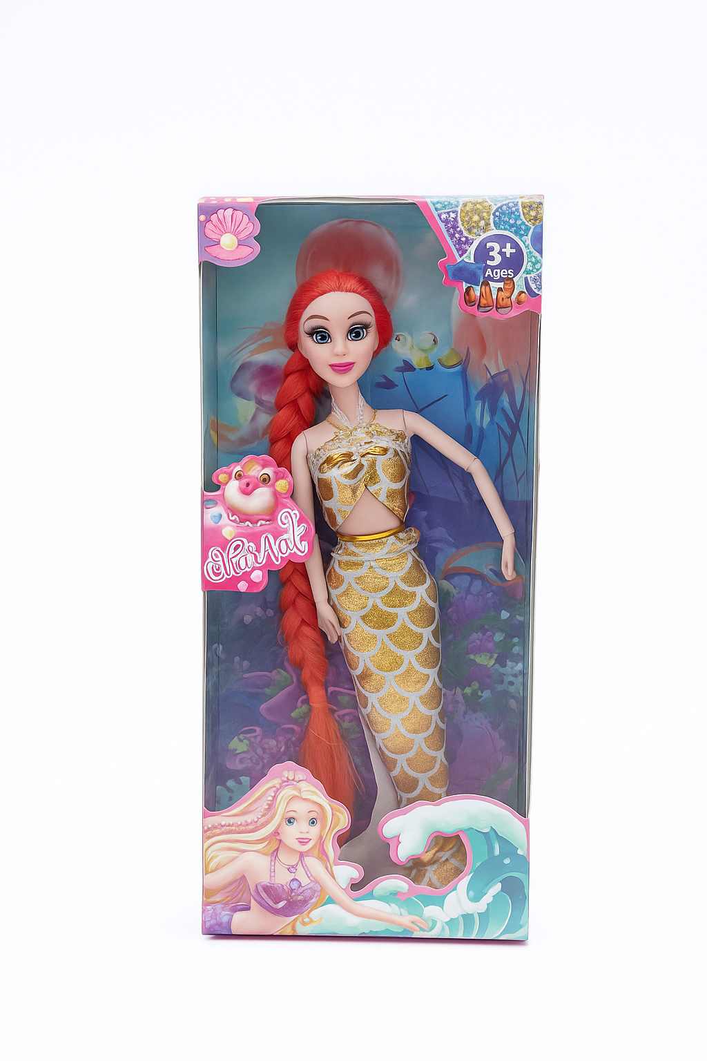 Papusa Sirena cu Par Rosu Impletit si Costum Auriu, 32x14 cm
