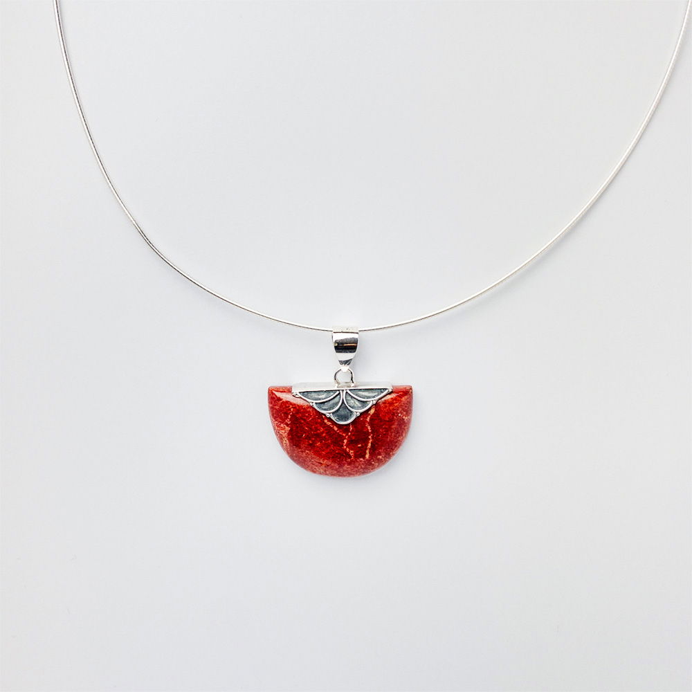 Pandant semirotund din coral natural cu decoratiune minimalista din argint 925 Marime unica