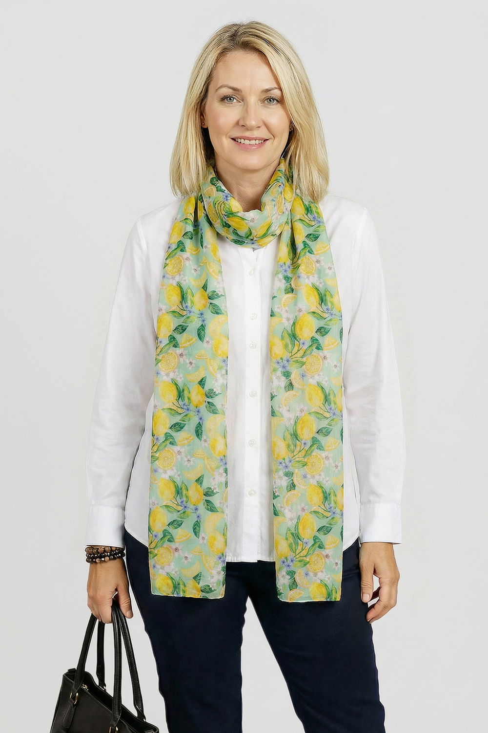 Esarfa dreptunghiulara cu doua fete, din matase, cu imprimeu fresh cu lamai pe fond verde menta