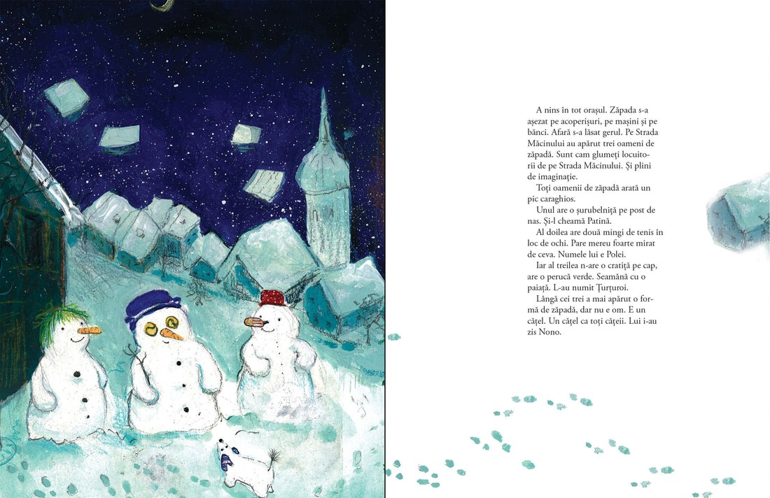 Trei oameni de zapada si-un catel tot de zapada | Olina Ortiz
