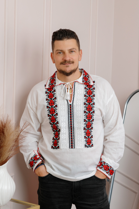 Camasa barbateasca traditionala alba cu motiv floral rosu Denis