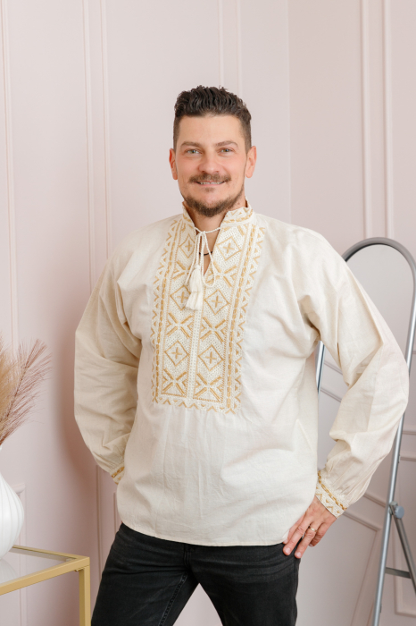 Camasa barbateasca traditionala crem cu motiv geometric auriu Silviu 02