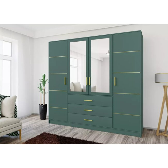 Dulap Bali 2D3 cu oglindă, bară haine, 3 sertare, PAL laminat, 147x58x200 cm, verde