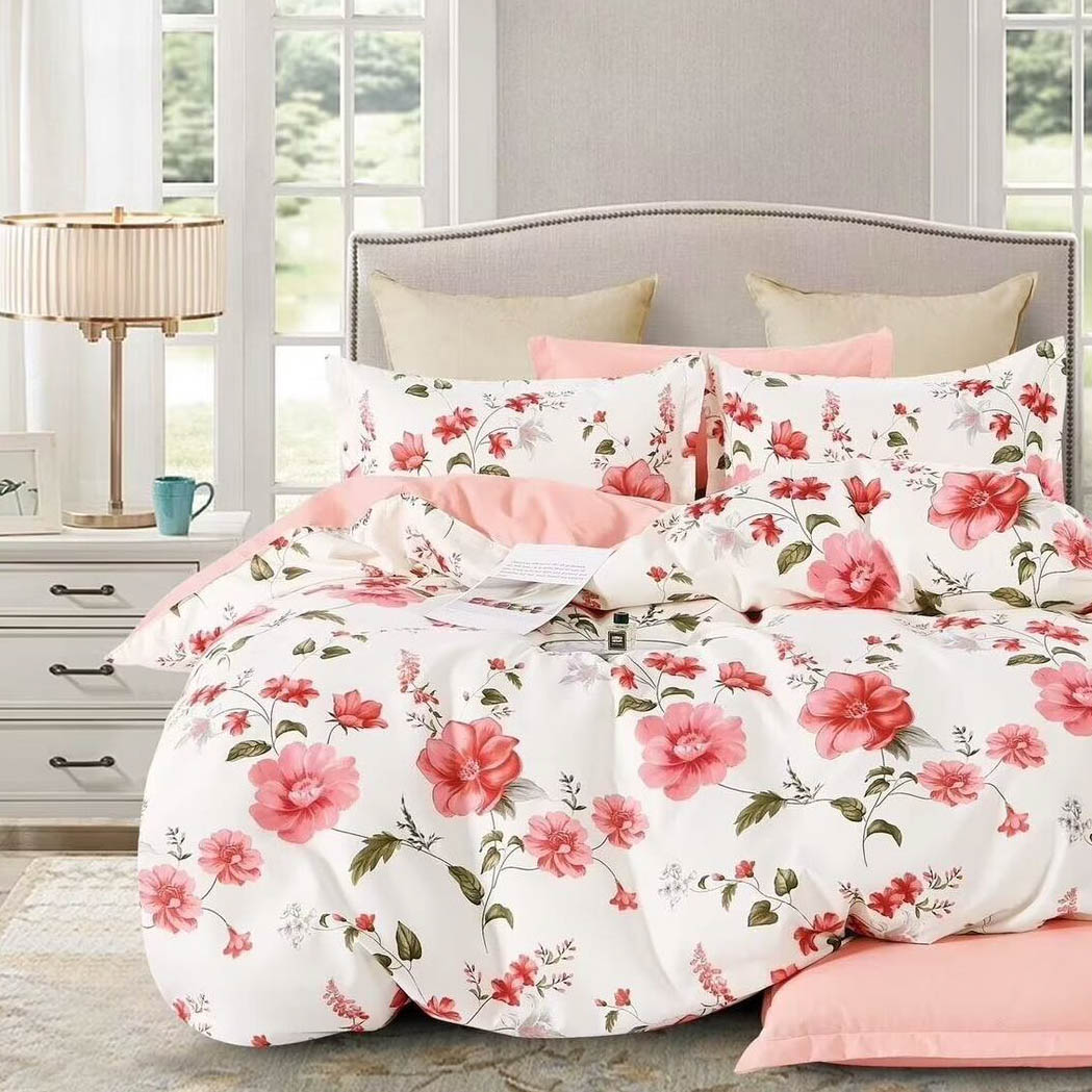 Lenjerie pat dublu, Finet, 6 piese, Alb, Roz, flori