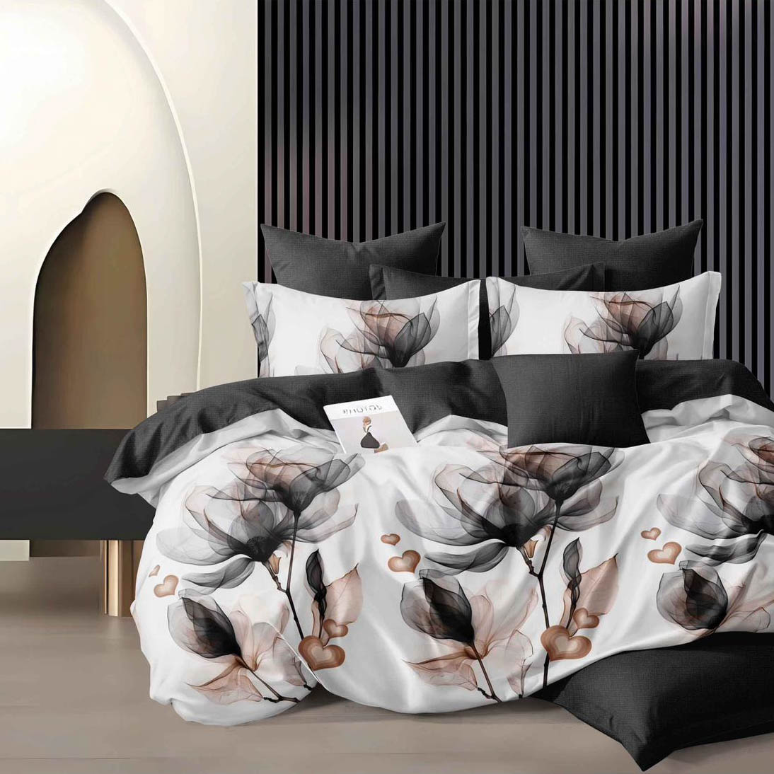 Lenjerie pat dublu, Finet, 6 piese, Alb, Negru, flori