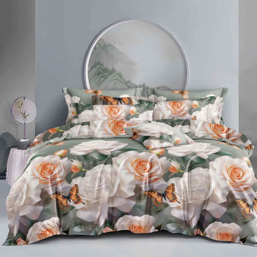 Lenjerie pat dublu, Finet, 6 piese, Verde, trandafiri