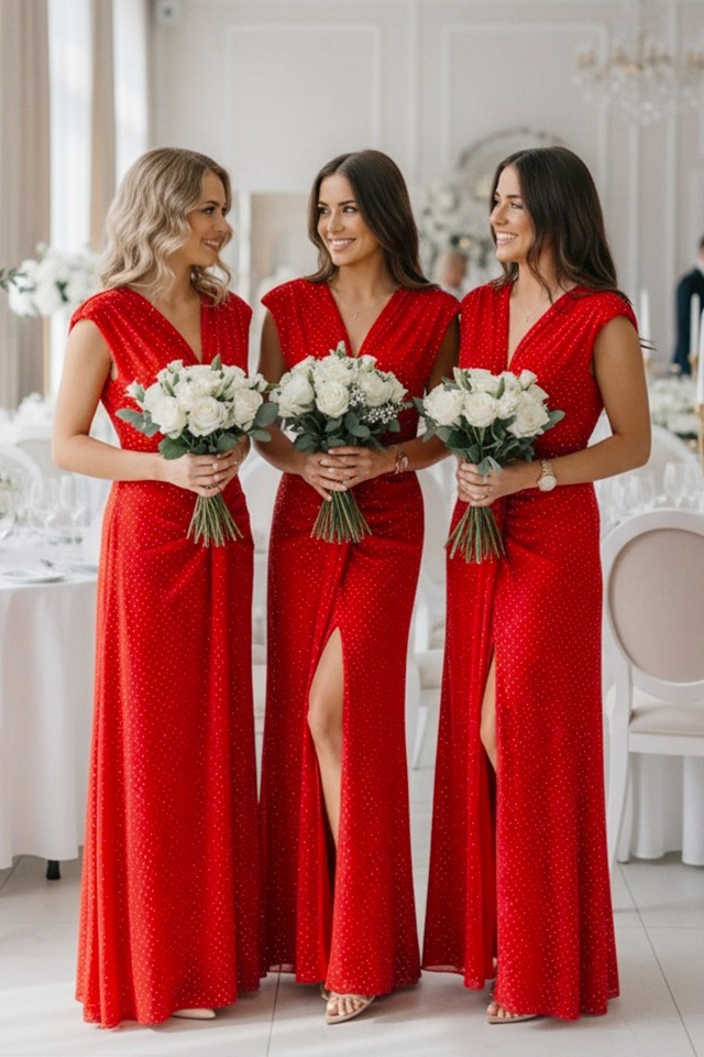 Set 3x Rochie satinata de seara, JoeLLe, din colectia domnisoare de onoare, Rosu, Marime S/M
