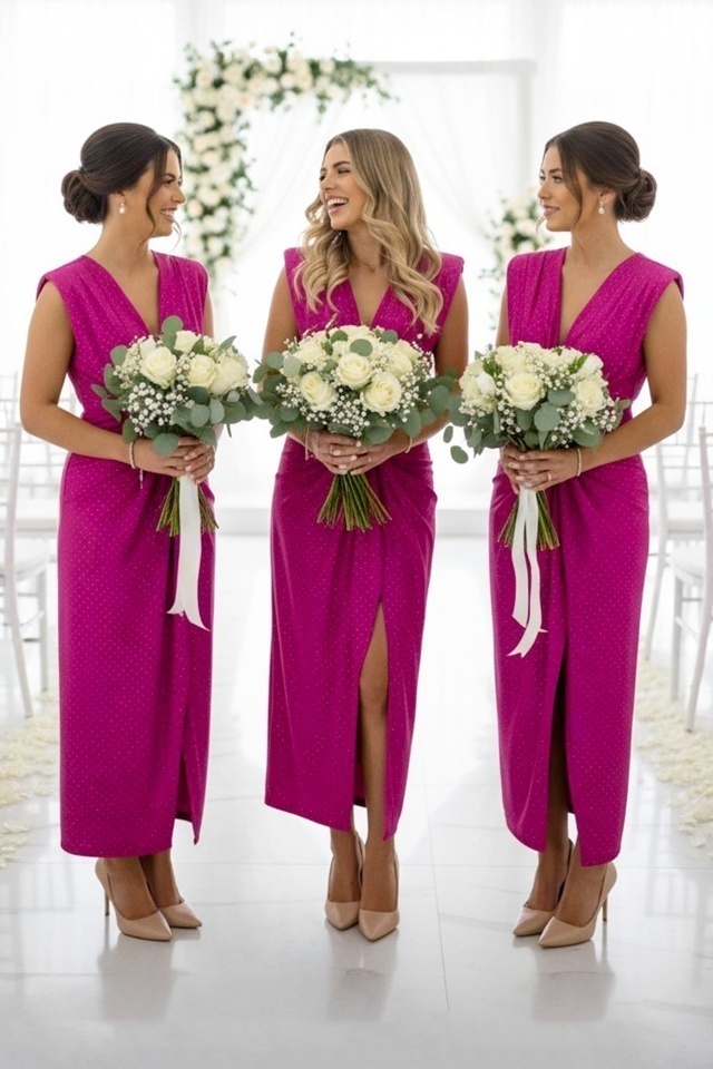 Set 5 bucati Rochie lunga satinata Ilaria, cu croiala conica, Fucsia, Marime S/M
