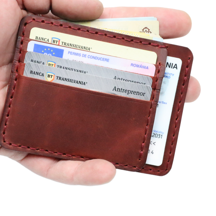 Portofel minimalist din piele naturala, lucrat si cusut manual, Hapi, Handmade, Rosu, Produs in Romania
