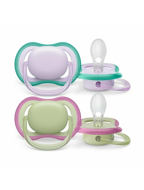 Set 2 suzete bebelusi, Philips Avent, Ultra Air, Ortodontice, Silicon moale igienic, Disc de protectie moale si flexibil, Fara BPA, 0- 6 luni+, Fosforescente, Deco Verde/Mov