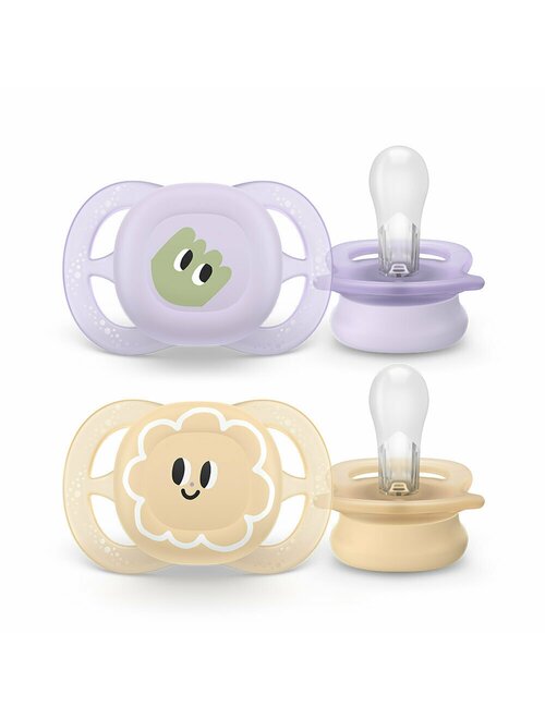 Set 2 suzete bebelusi, Philips Avent, Ultra Start, Ortodontice, Silicon moale, Usoare, Fara inel si fara BPA, Conceputa pentru gurite micute, 0-2 luni, Deco Galben/Mov