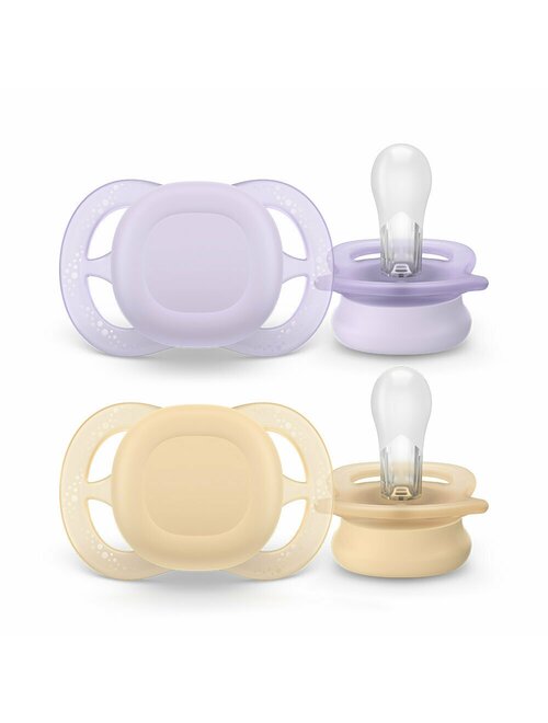 Set 2 suzete bebelusi, Philips Avent, Ultra Start, Ortodontice, Silicon moale, Usoare, Fara inel si fara BPA, Conceputa pentru gurite micute, 0-2 luni, Galben/Mov