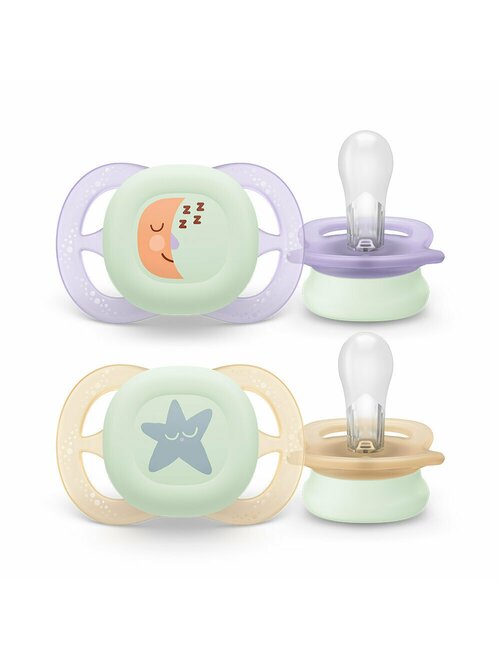 Set 2 suzete bebelusi, Philips Avent, Ultra Start, Ortodontice, Silicon moale, Usoare, Fara inel si fara BPA, Fosforescente, Fara BPA, 0-2 luni, Cu model, Verde/Mov