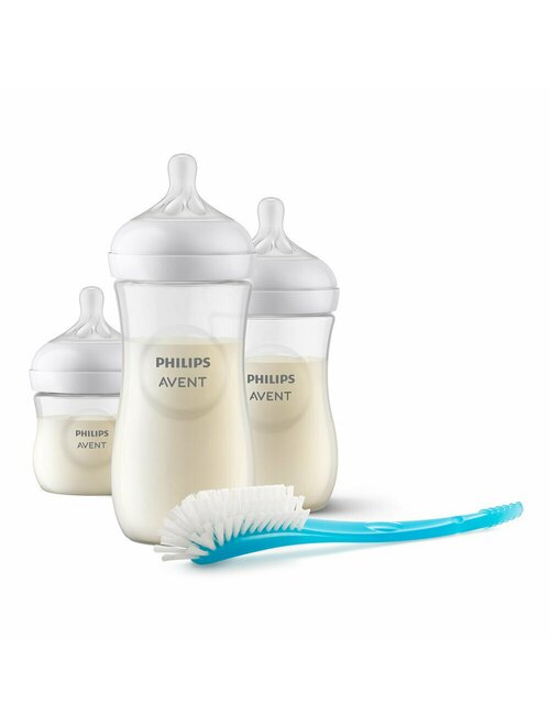Set nou-nascuti, Philips Avent, Natural Response, 3 biberoane si 1 perie pentru biberoane, 125 ml, 260 ml, 330 ml, 0-3 luni+, Tetina fara scurgeri, Transparent