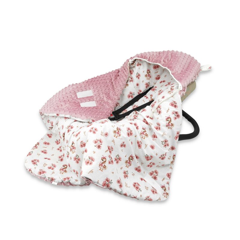 Paturica calduroasa, MimiNu, Pentru scoica, scaun auto/carucior, Cu gluga si urechi, Dimensiune 90x90 cm, Din Minky + Bumbac, Materiale certificate Oeko Tex Standard 100, Design, Ducklings Powdery Pink
