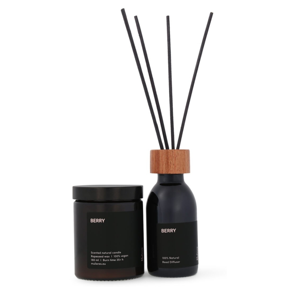 Set lumanare naturala si difuzor natural cu betisoare din trestie Berry (180ml+100ml), Mulieres