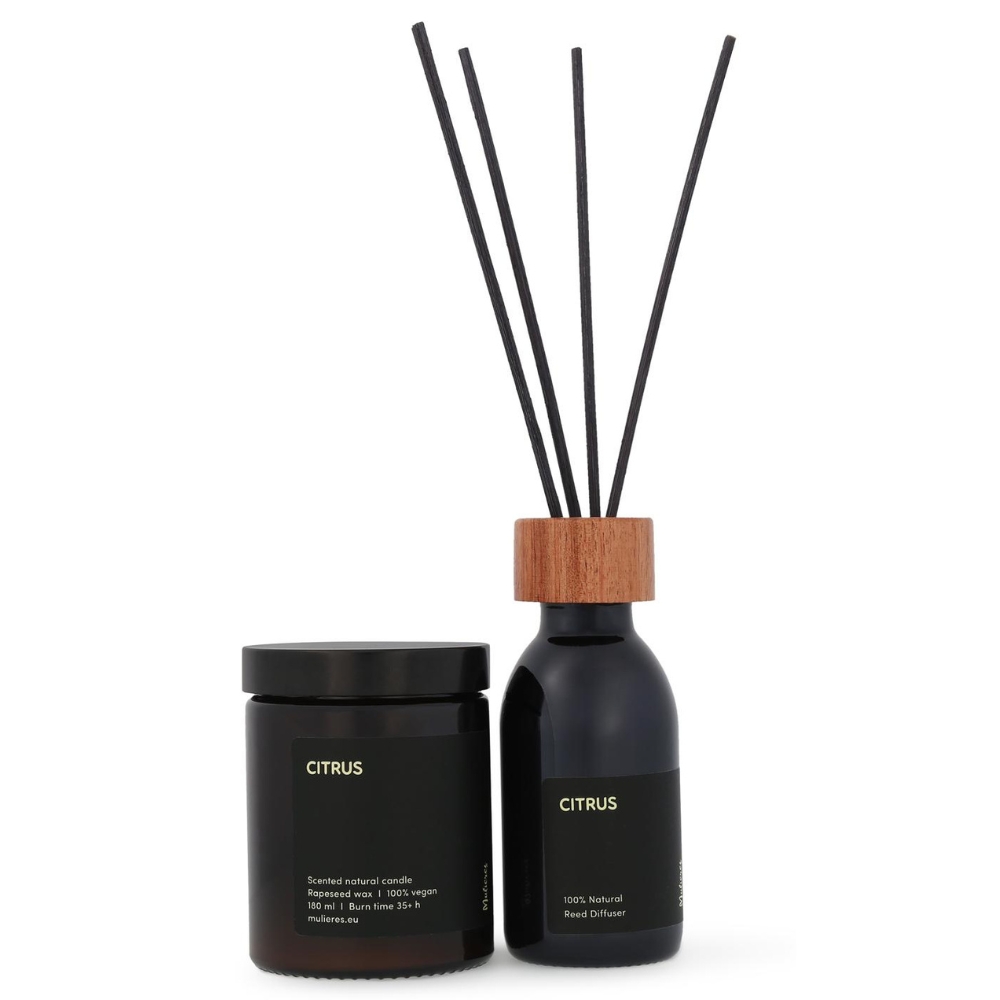 Set lumanare naturala si difuzor natural cu betisoare din trestie Citrus (180ml+100ml), Mulieres