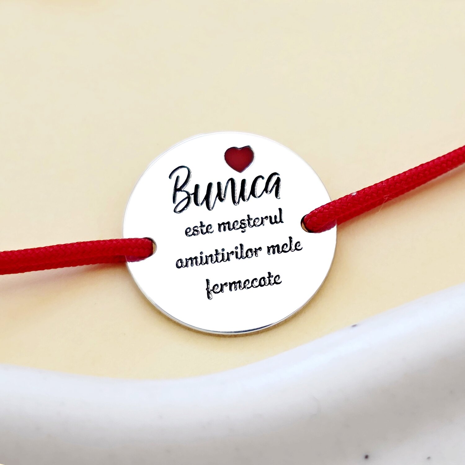 Bratara festiva - Bunica mesterul amintirilor - Banut gravat si simbol inima cu email - Argint 925 - Snur reglabil