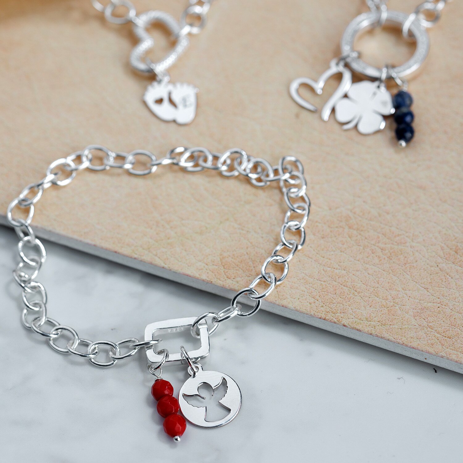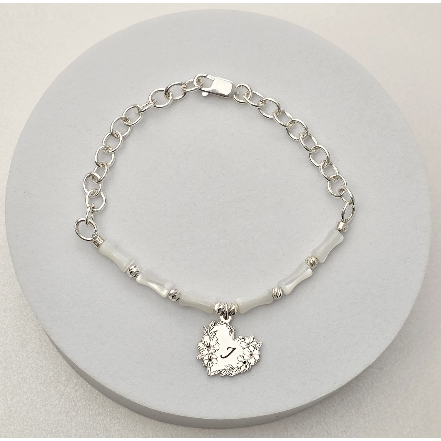Bratara Buchet din Inima - Personalizat cu Initiala – Pietre Bambus sidef si Bilute – Argint 925