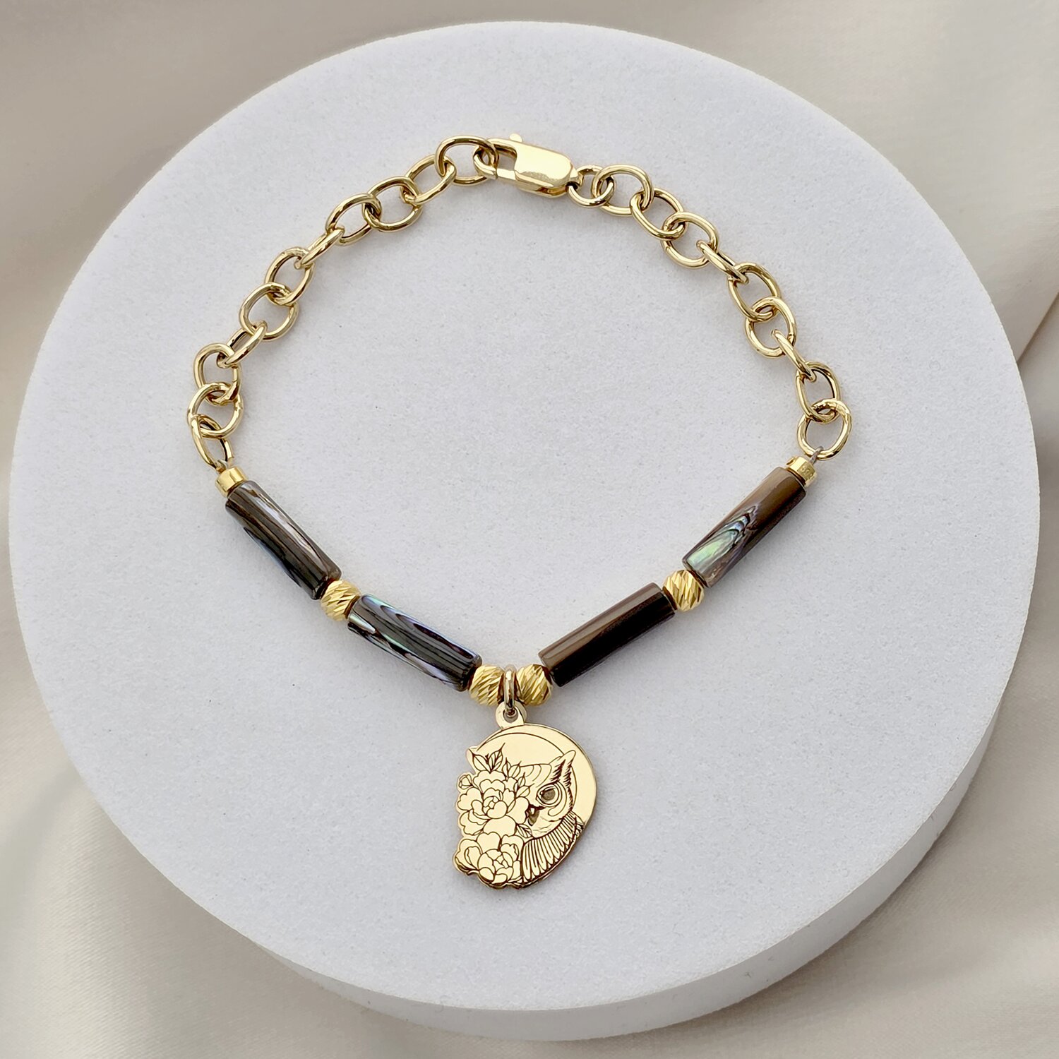 Bratara Bufnita Aurie - Perle Tubulare abalone metalizate & Bilute - Argint 925 placat cu Aur 18K