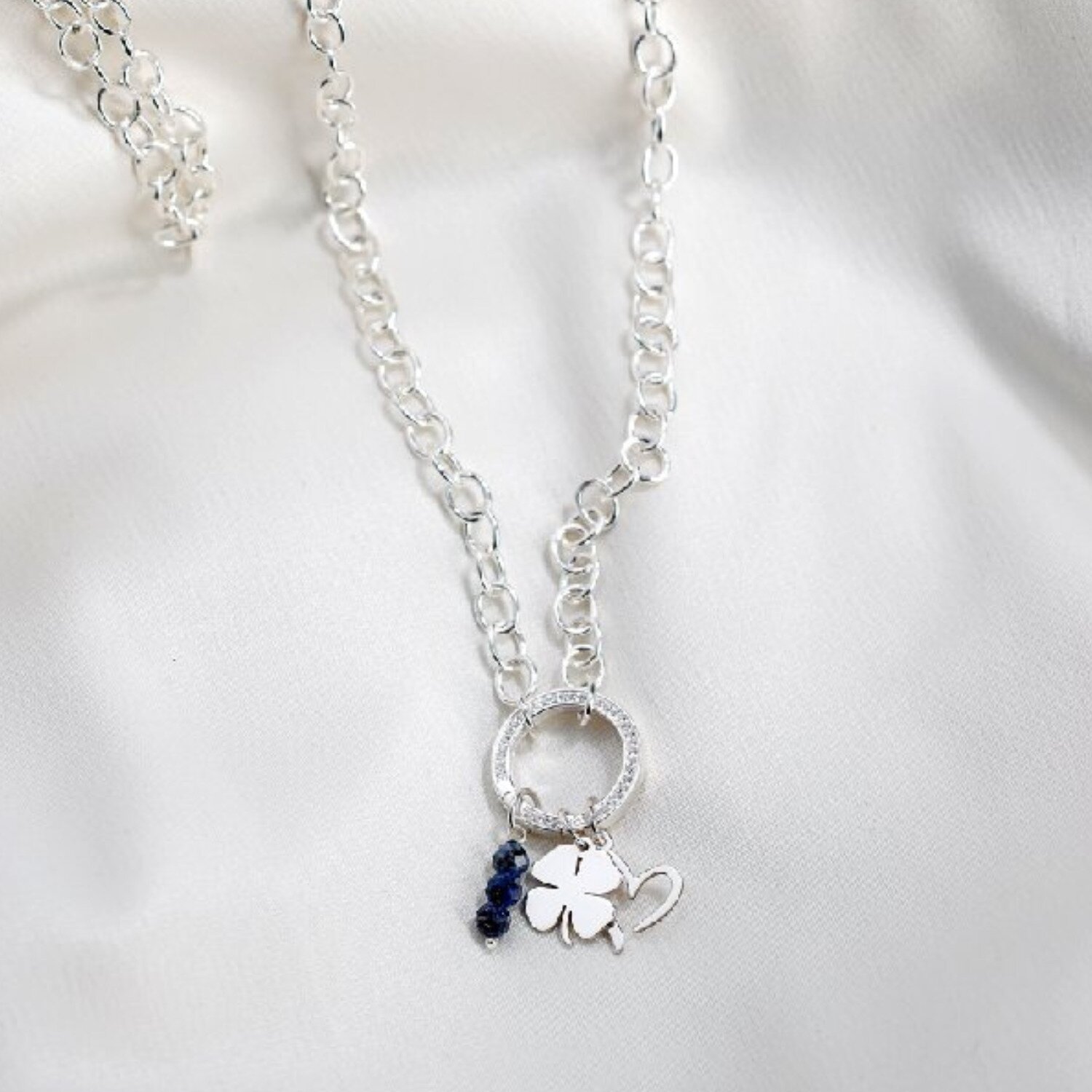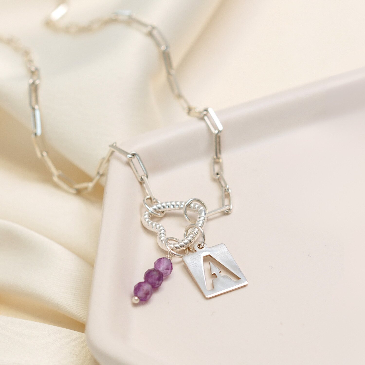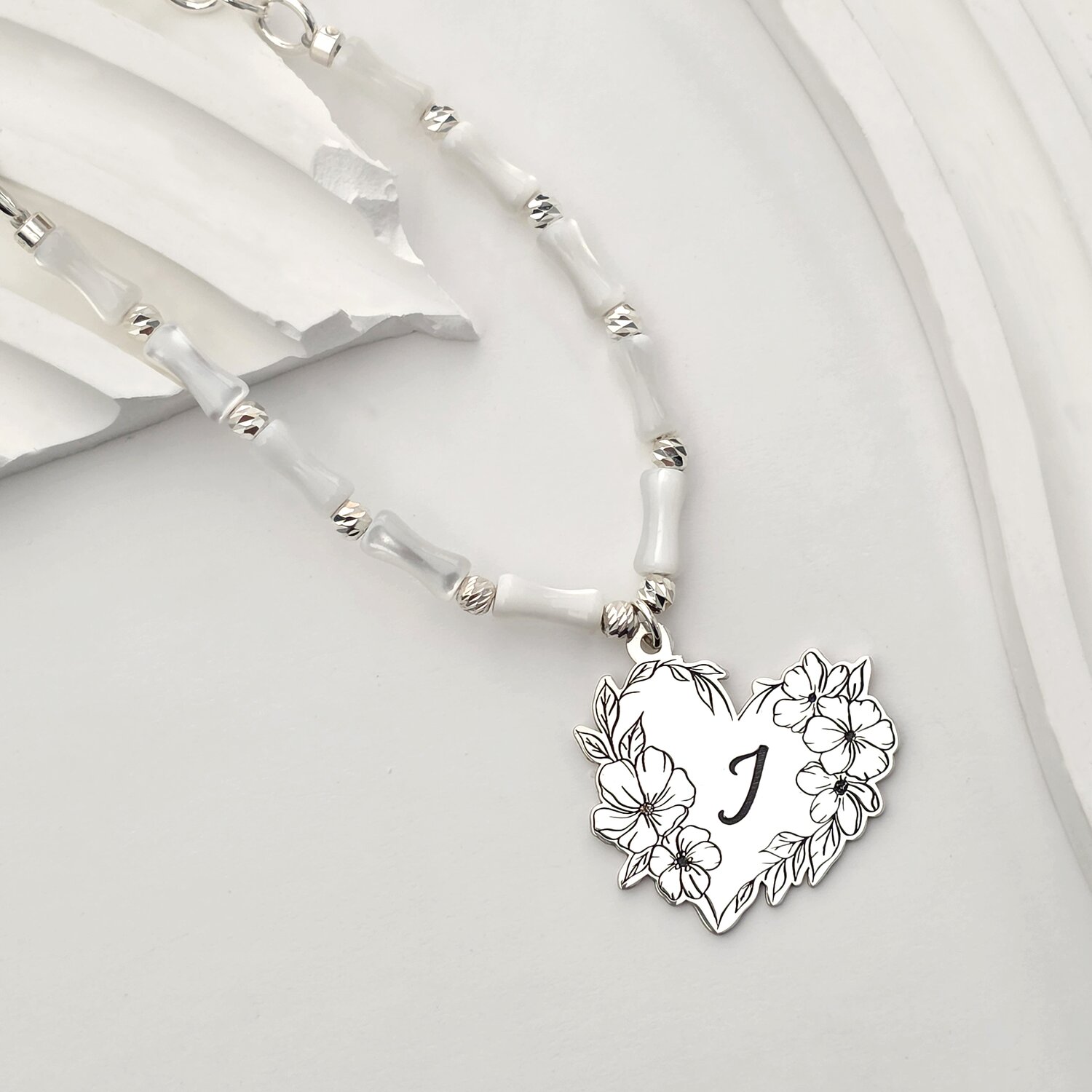 Colier Buchet din Inima - Personalizat cu Initiala - Lant combinat cu Pietre Bambus & Bilute - Argint 925