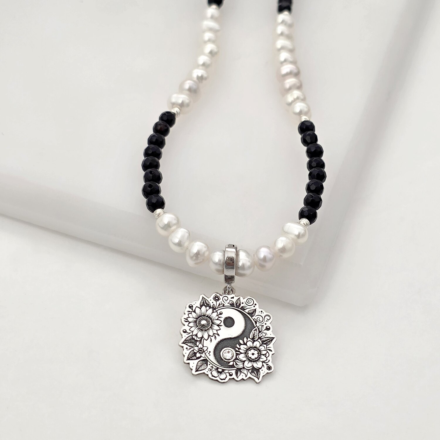 Colier Floare Yin & Yang si Cristal Swarovski - Combinatie de Perle Albe & Onix - Argint 925