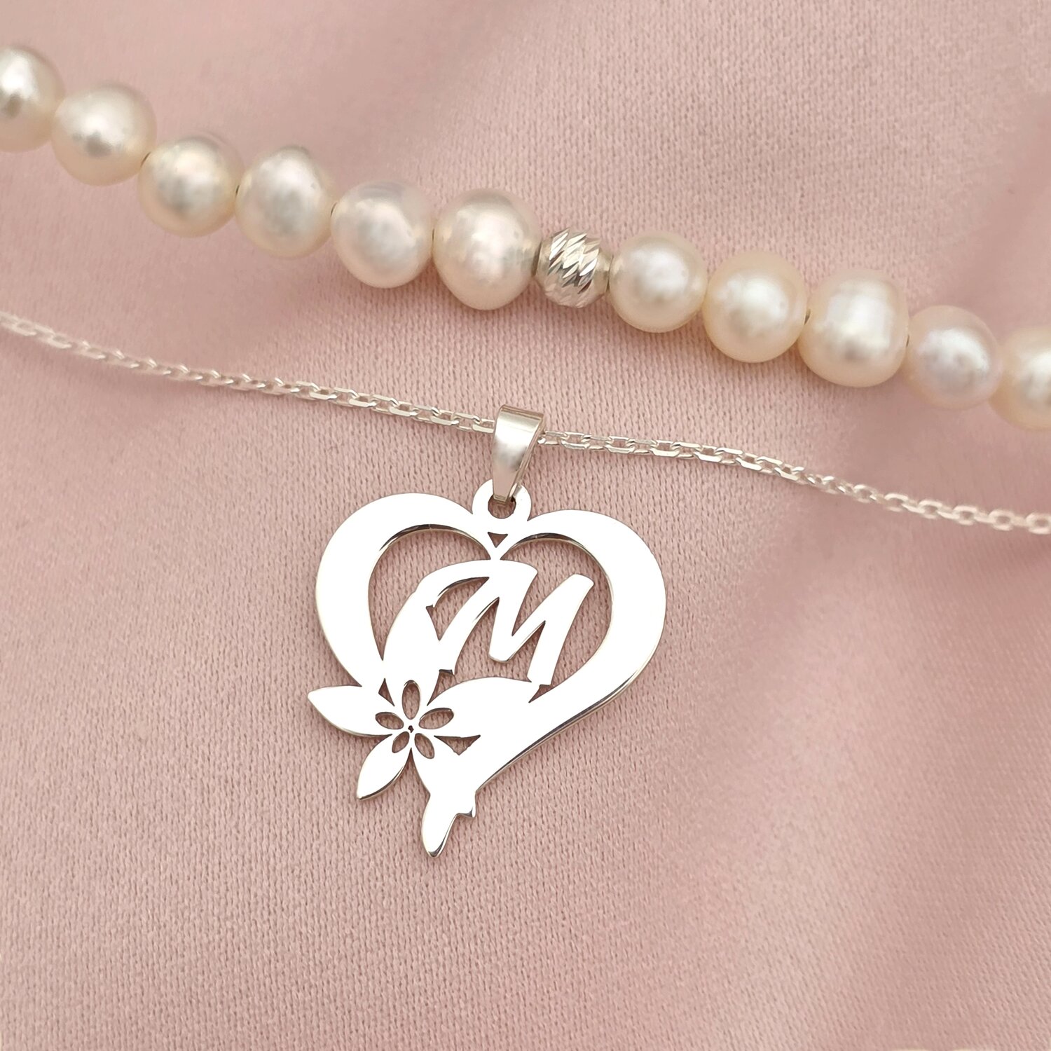 Colier Floarea Dragostei - Pandantiv inima cu initiala - Lantisor & Sirag de Perle - Argint 925