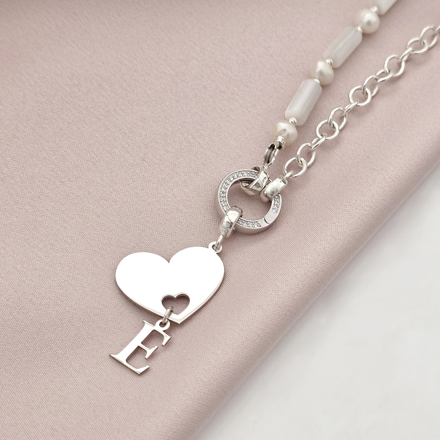 Colier Inima ta, initiala ta - Combinatie lant & Perle sidef tubulare - Argint 925