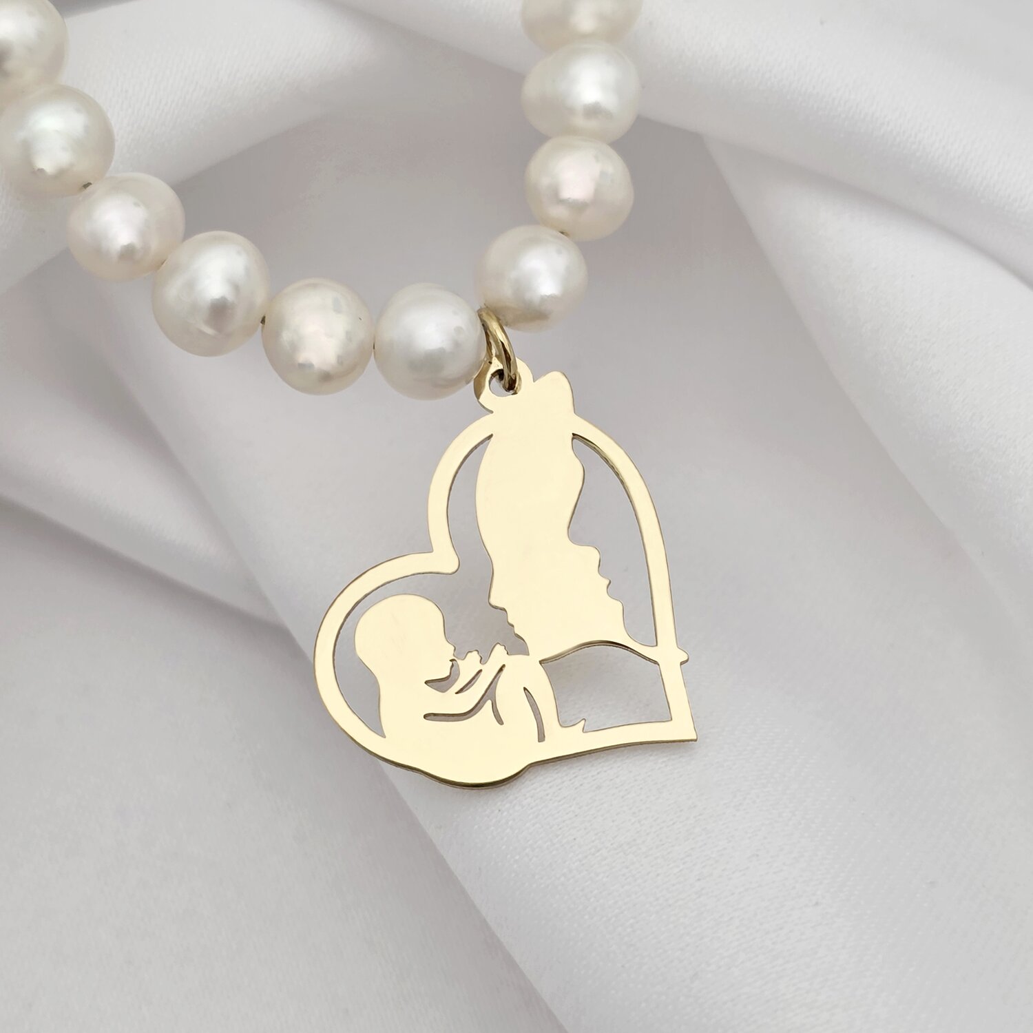 Colier Legatura Eterna - Inima cu Silueta Parintilor si Bebelus Fetita cu Fundita & Sirag de Perle - Argint 925 placat cu Aur Galben 18K