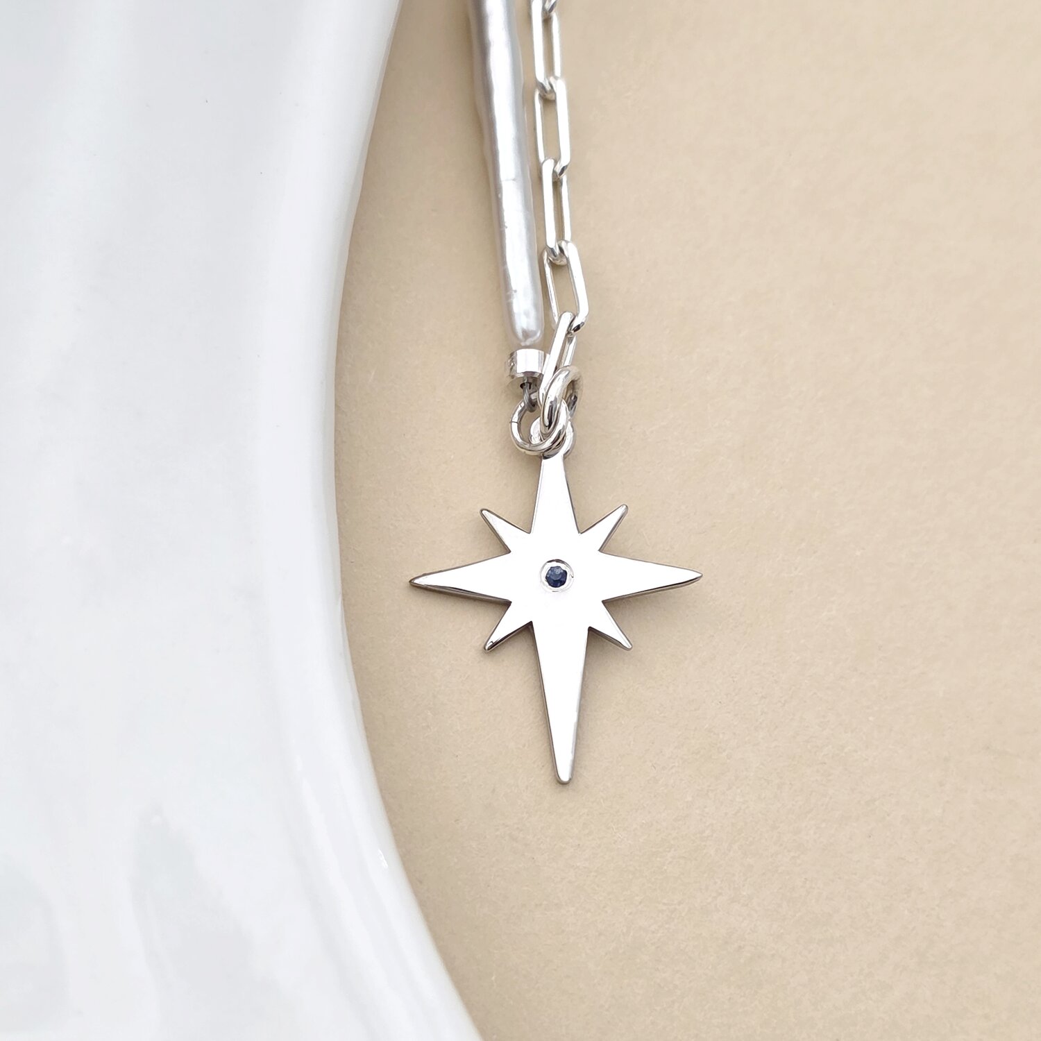 Colier Luceafar - Pandantiv stea cu Safir Albastru - Combinatie lant cu Perle Stick & Bilute - Argint 925 Rodiat