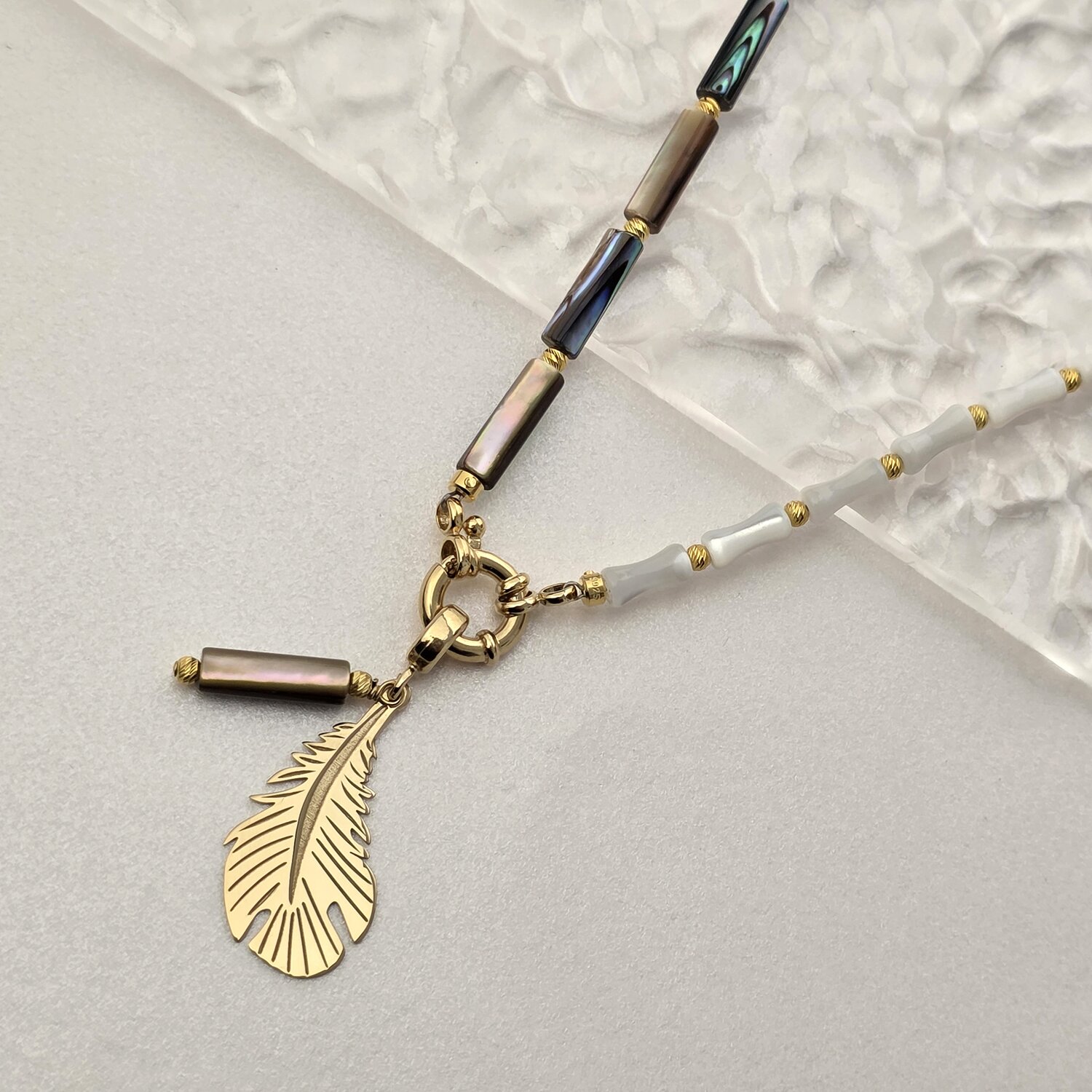 Colier Pana Aurie - Pietre Tubulare Colorate, bambus & abalone - Argint 925 placat cu Aur 18K