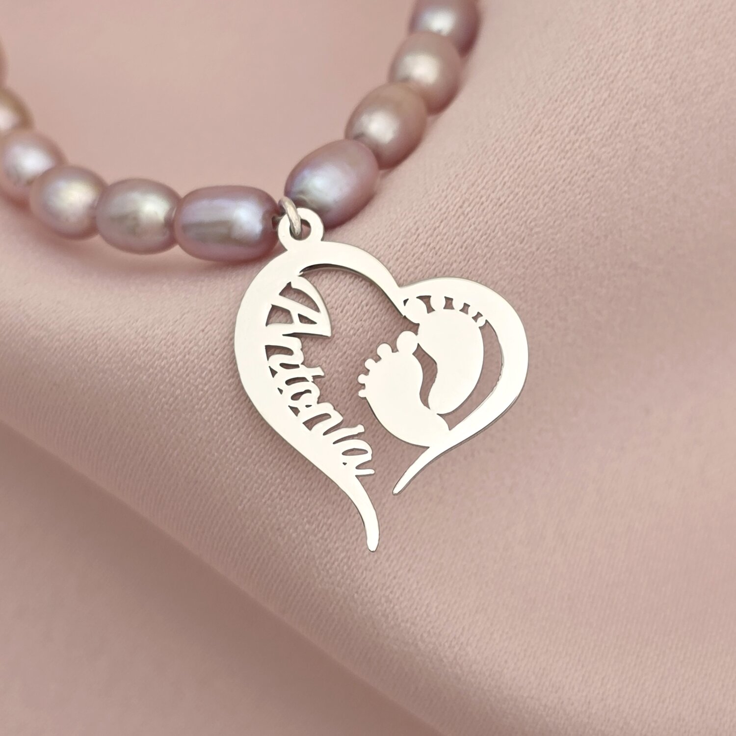Colier Primii Pasi - Inima cu Picioruse si Nume & Sirag de Perle - Argint 925