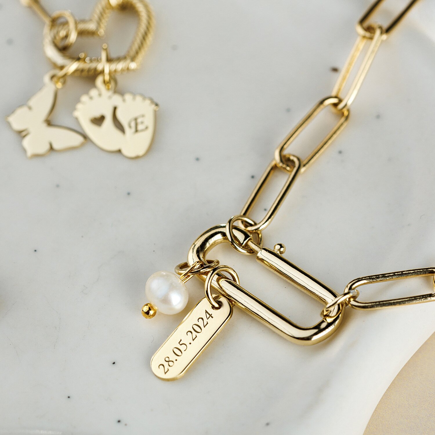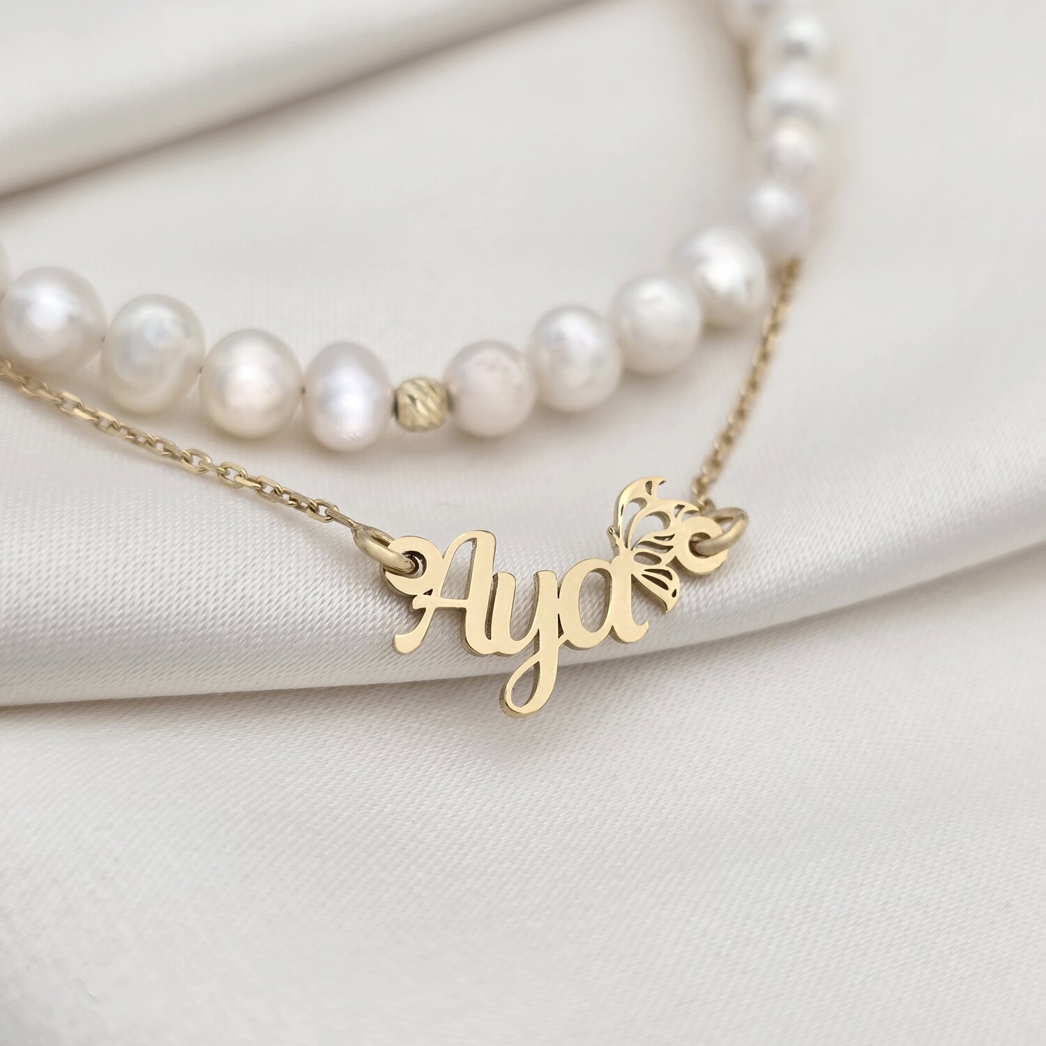 Lantisor cu Nume - Font Elegant & Fluturas - Combinat cu Sirag de Perle - Argint 925 placat cu Aur Galben 18K