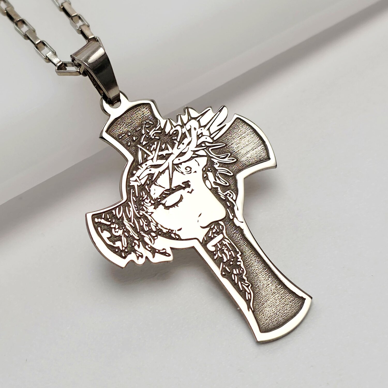 Lantisor Chipul lui Iisus pe crucea sfanta - Bijuterie cu Har pentru barbat - Argint 925 Rodiat - Lant cu zale groase