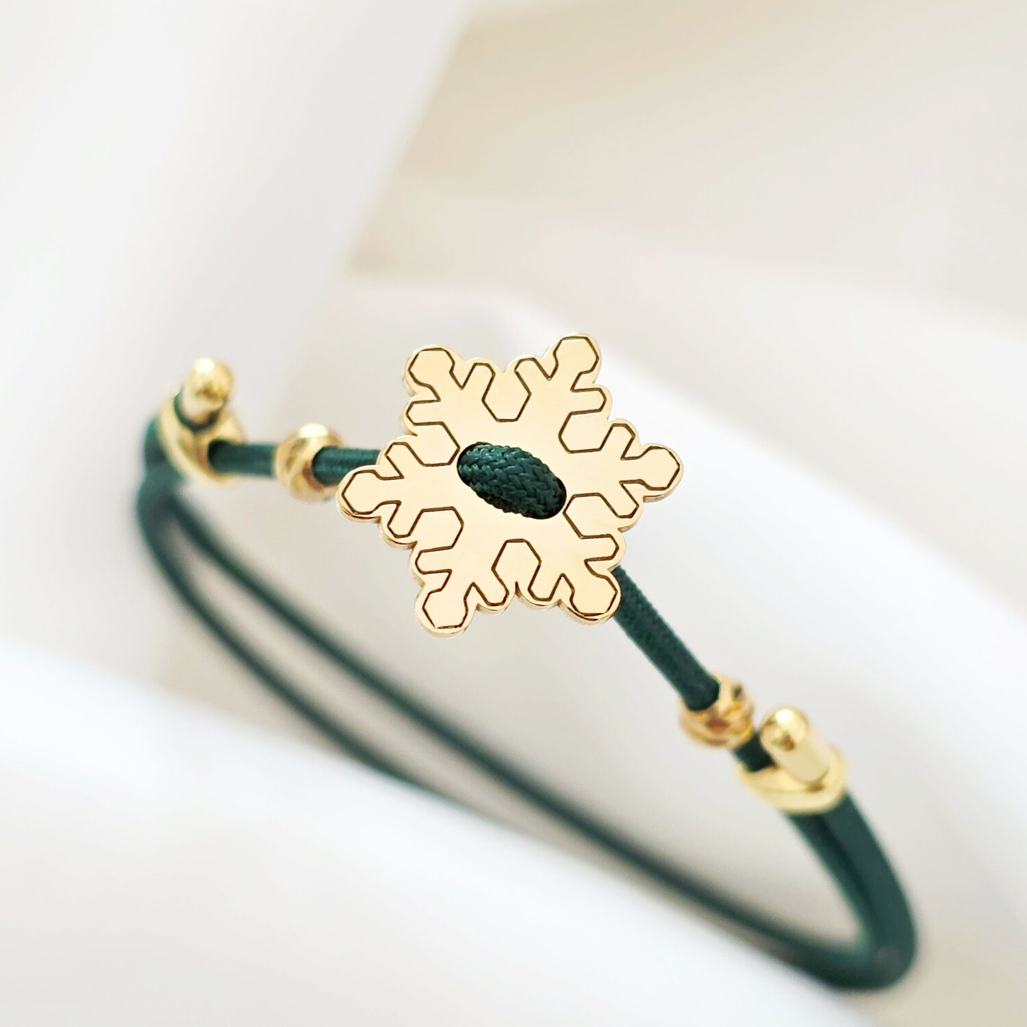 Brățara Fulg de nea - Șnur verde Gros si 2 bilute de 3 mm - Argint 925 placat cu Aur Galben 18K