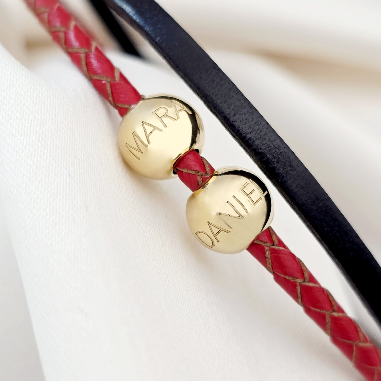 Bratara duo cu 2 straturi piele impletita rosie si neagra & 2 bilute din Argint 925 placat cu Aur Galben 18K - Inchizatoare inox
