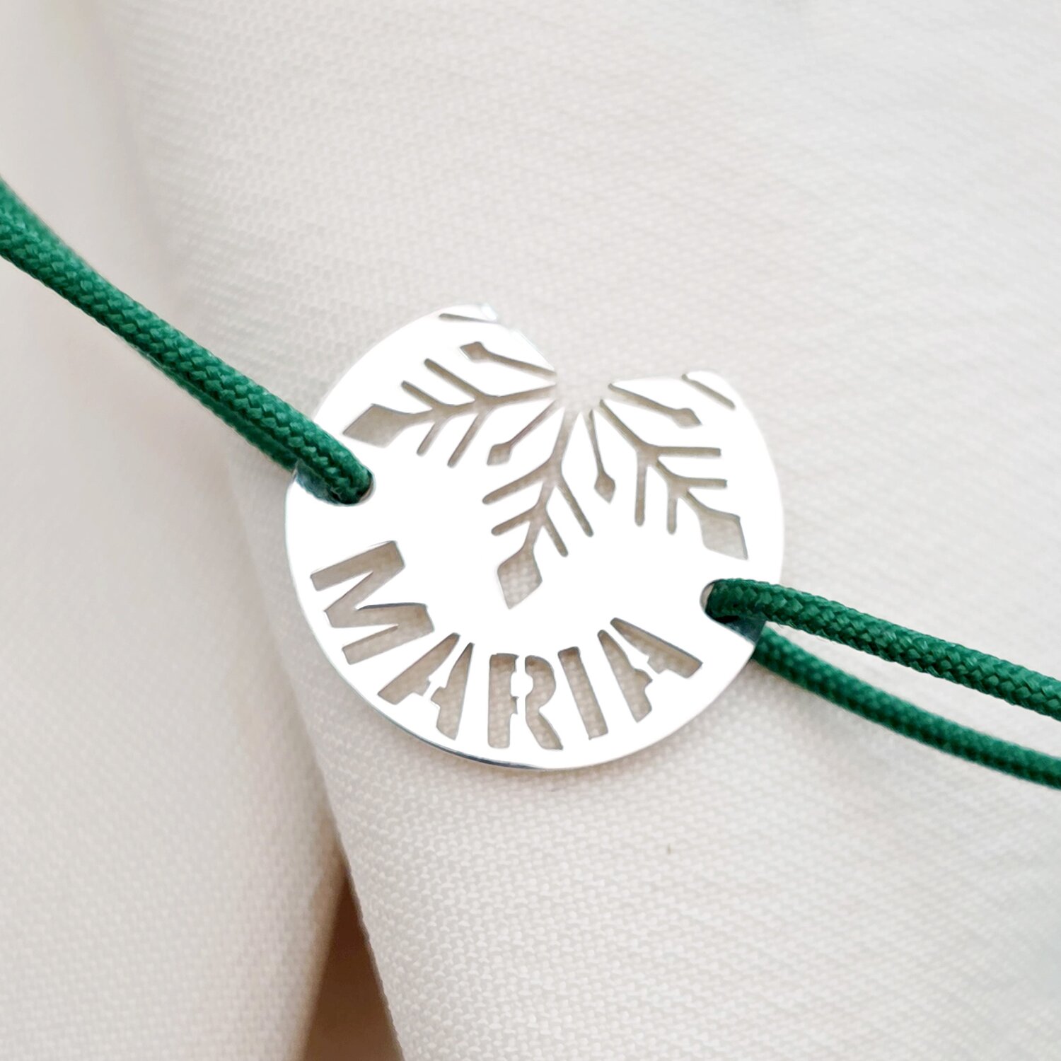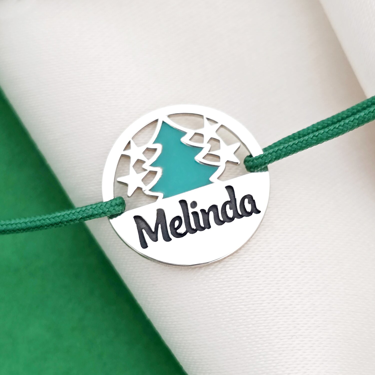 Bratara festiva - Disc cu bradulet colorat si nume personalizat - Argint 925 - Snur reglabil