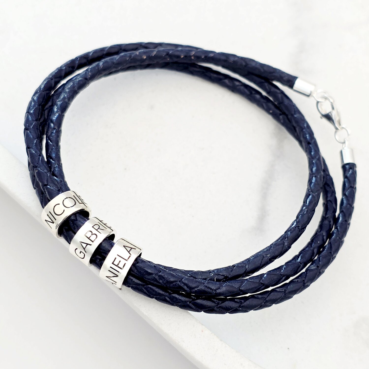 Bratara trio cu piele impletita albastra & 3 elemente cilindrice din Argint 925 - Inchizatoare carabina