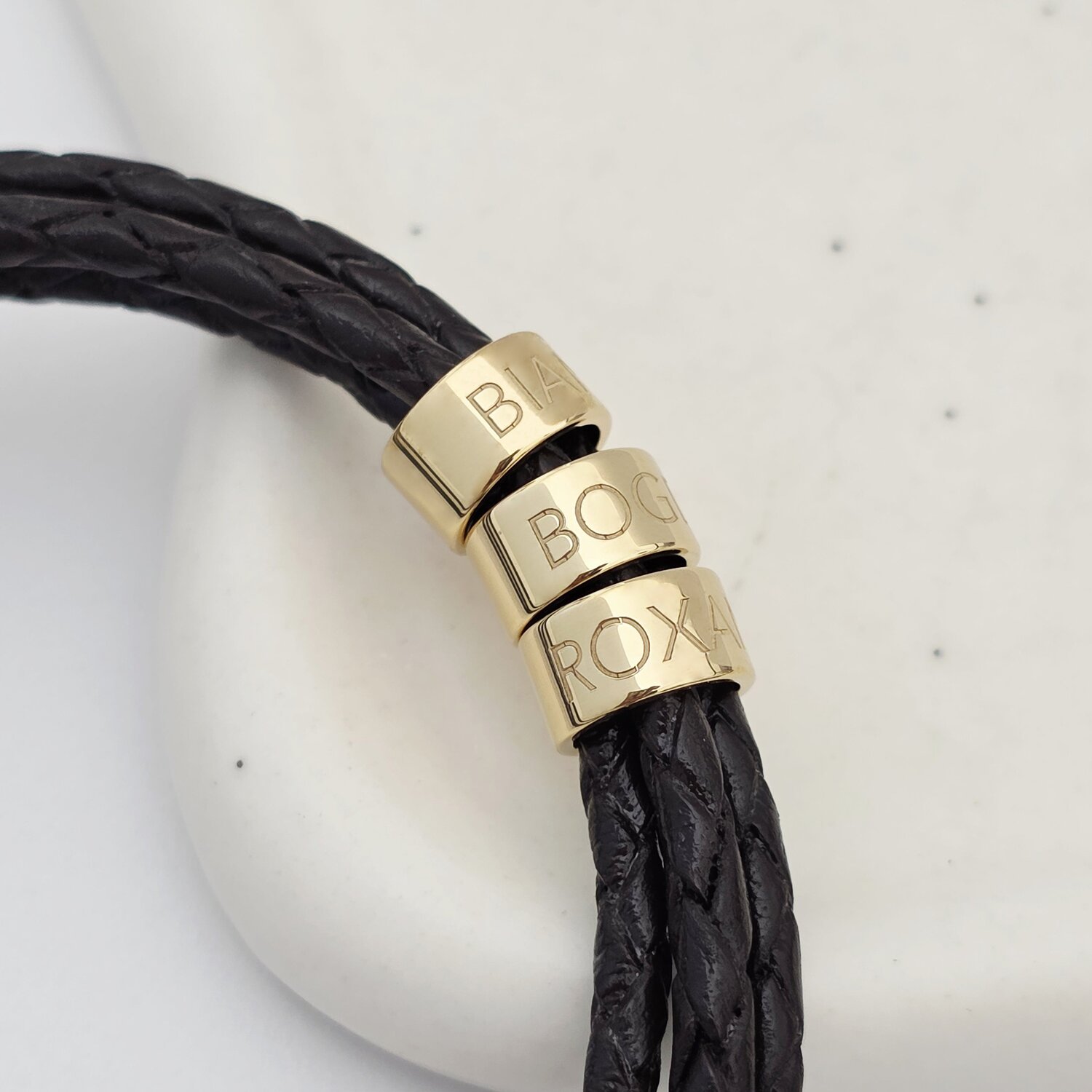 Bratara trio cu piele impletita neagra & 3 elemente cilindrice din Argint 925 placat cu Aur Galben 18K - Inchizatoare carabina