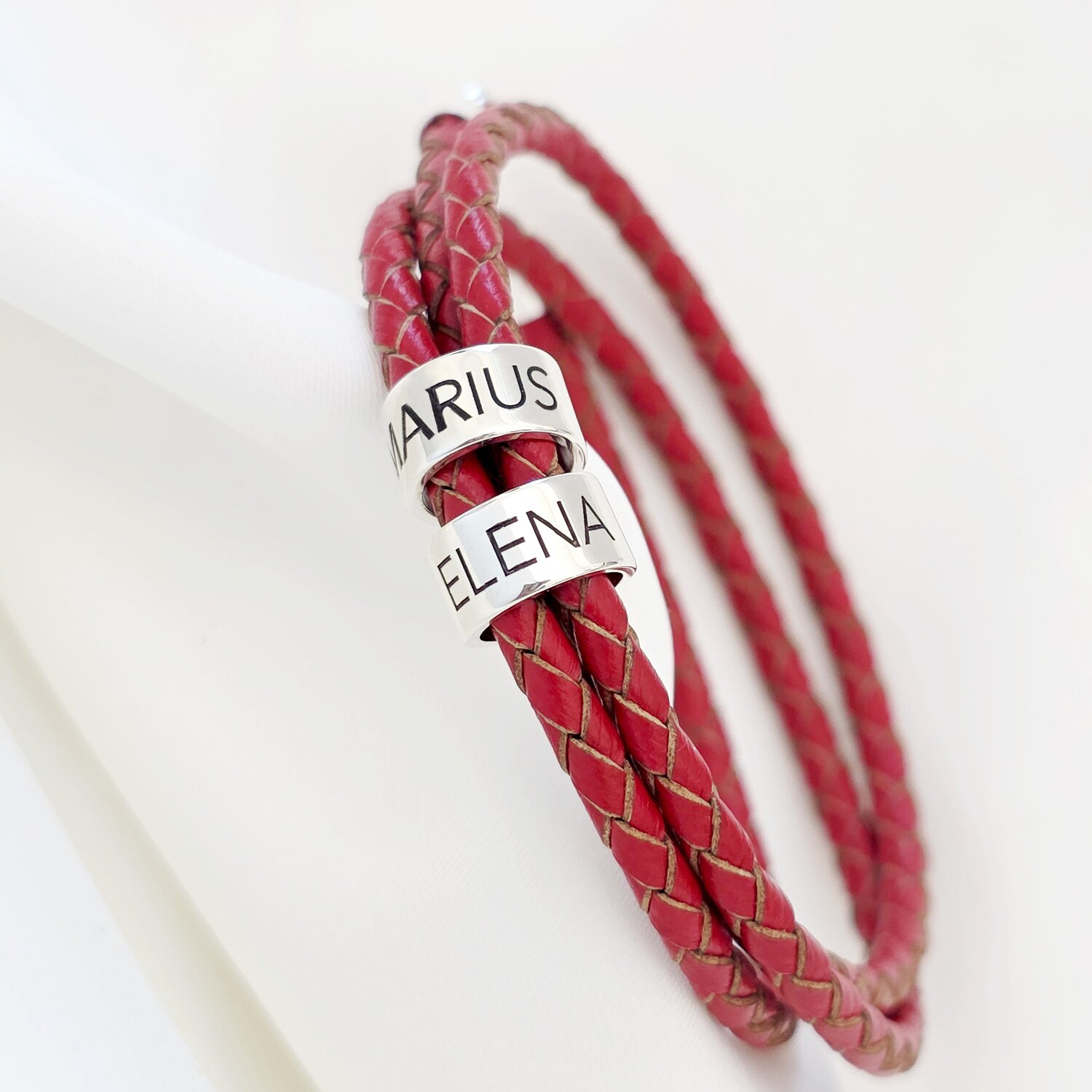 Bratara trio cu piele impletita rosie & 2 elemente cilindrice din Argint 925 - Inchizatoare carabina
