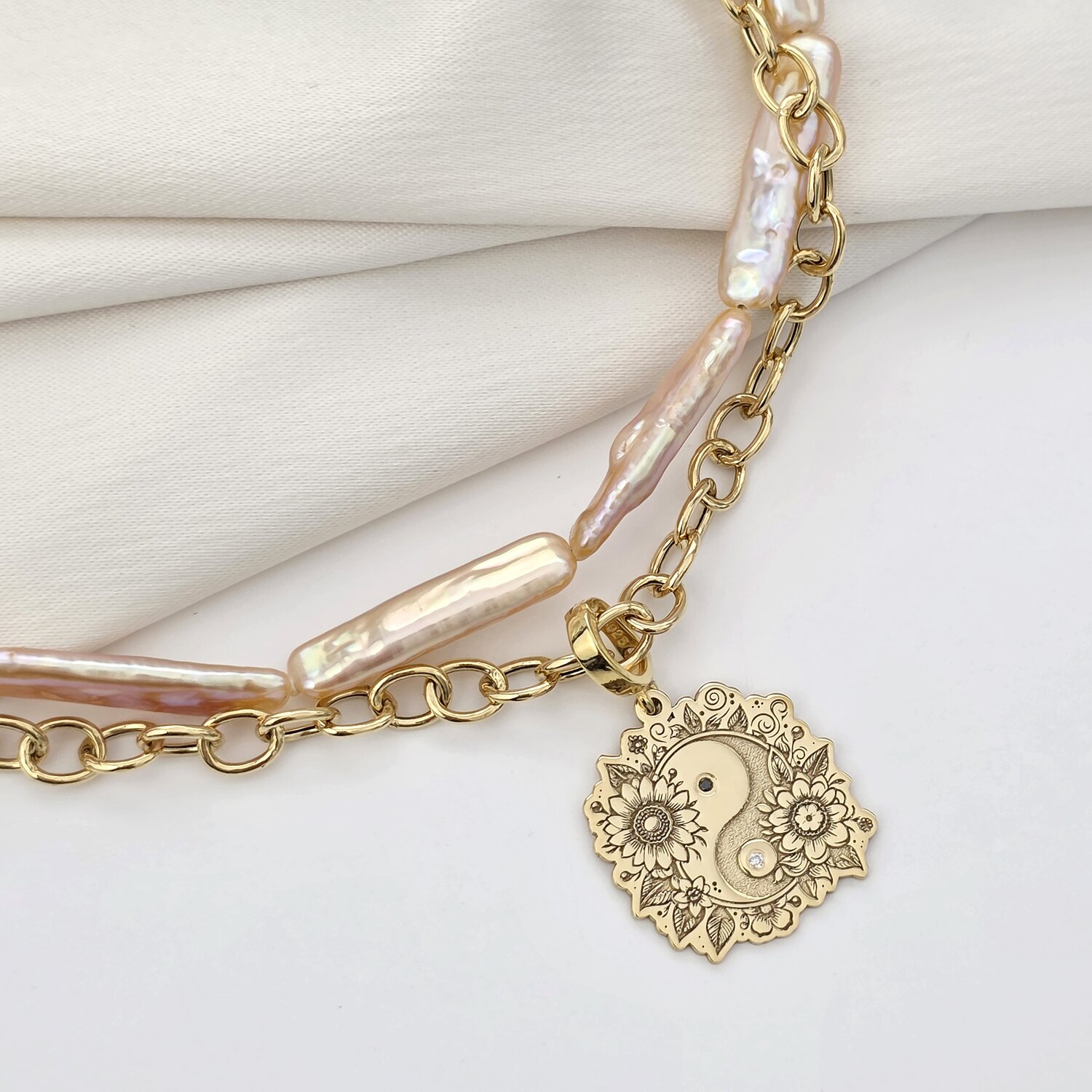 Colier Floare Yin & Yang si doua Diamante naturale - Combinatie sirag de Perle stick peach si lant cu zale rotunde - Argint 925 placat cu Aur Galben 18K
