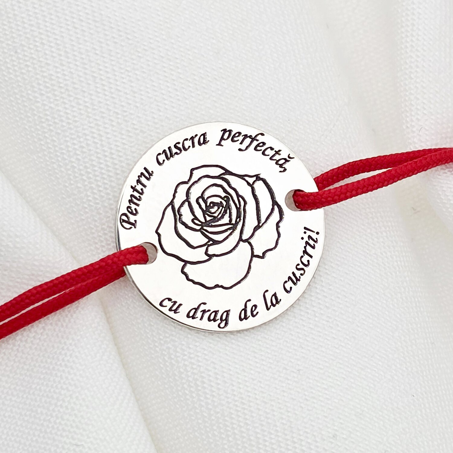 Bratara disc si nume decupat - Mama si floare cu email rosu - Argint 925 - Snur reglabil, diverse culori