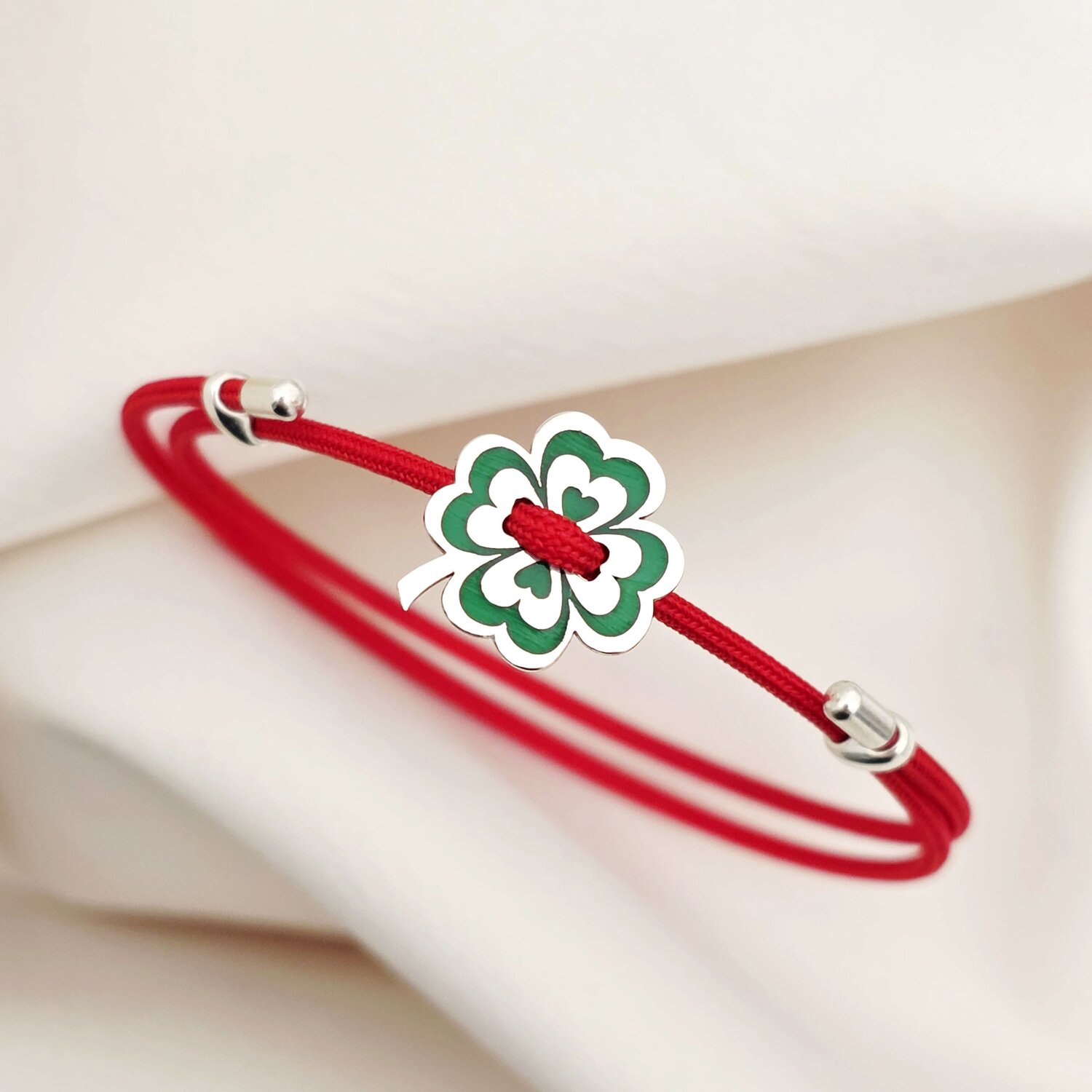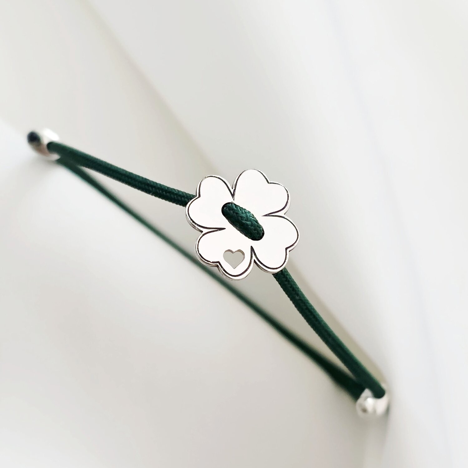 Brățara Trifoi cu patru foi si inima decupata - Șnur verde Gros - Argint 925