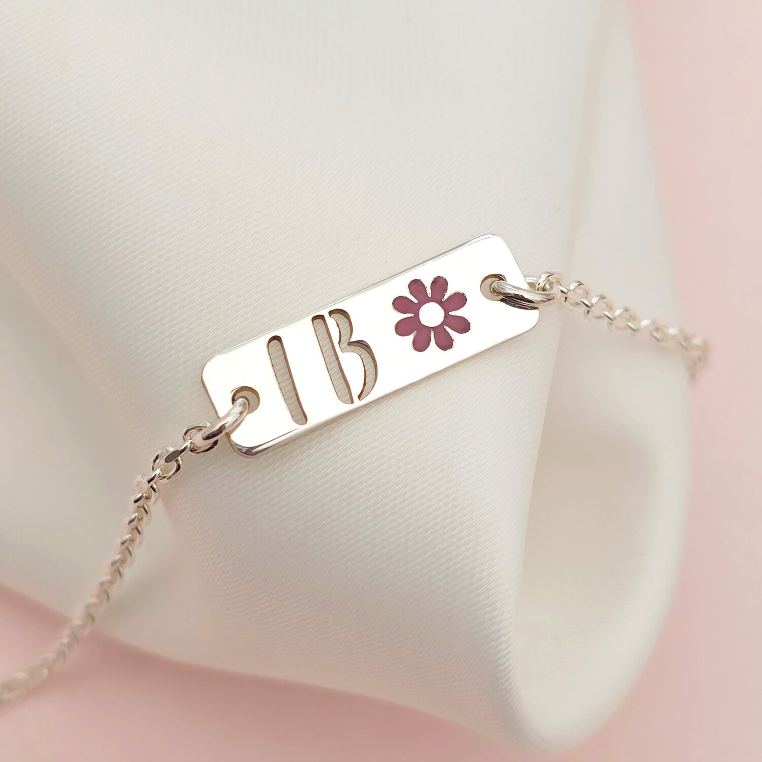 Bratara placuta simbol floare - initiale personalizate - Argint 925- Cu lantisor fata/baiat