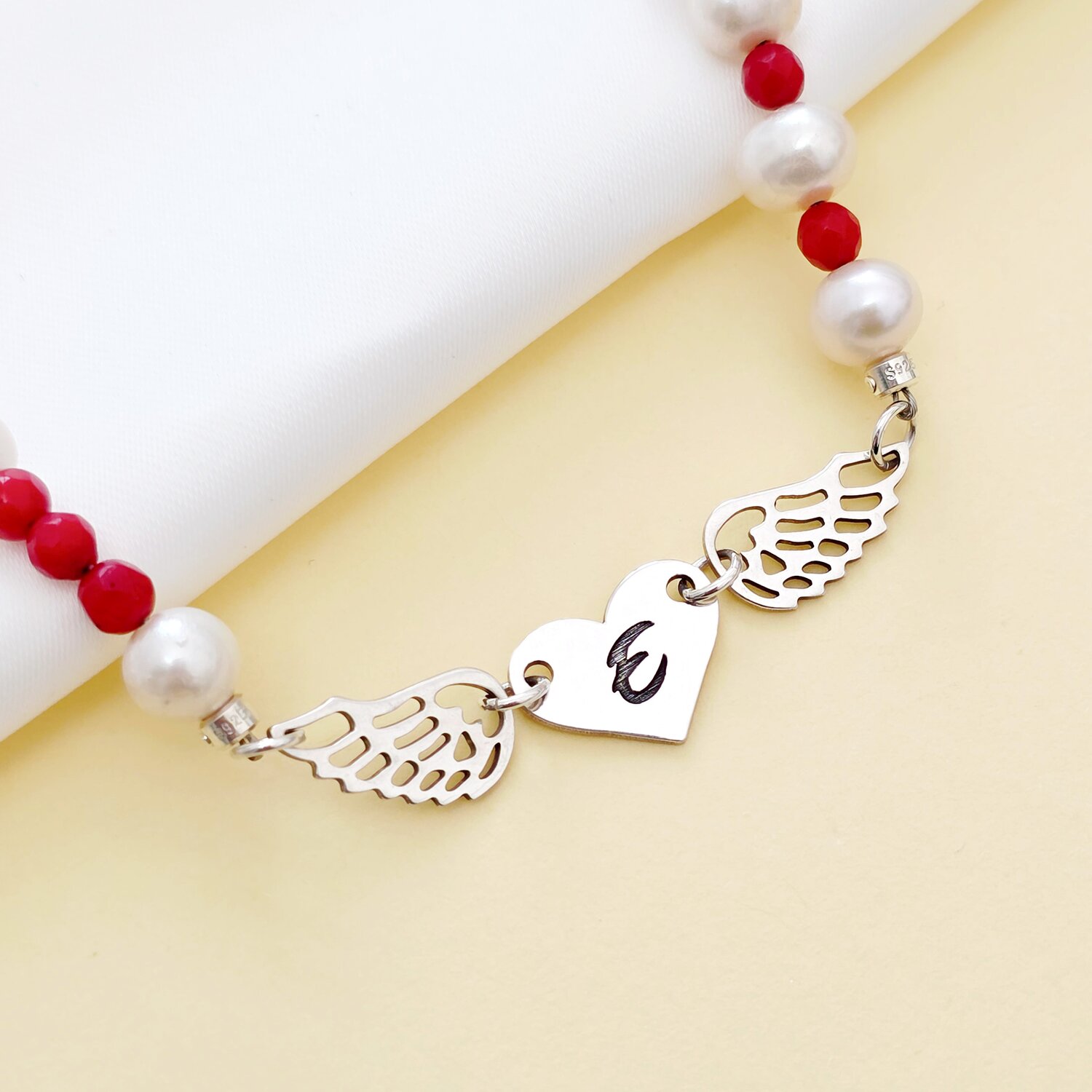 Bratara de picior – Inima cu initiala si aripi de inger – Argint 925 – Model lantisor, perle si coral